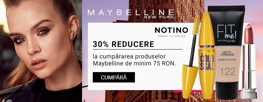 Profita acum de reducerea de -30%. Se aplica la cumpărarea produselor Maybelline în valoare de minim 75 RON doar în magazinul online Notino. Introduceți codul de reducere în coșul de cumpărături. Folosiți voucher Notino beneficiati de promotii!